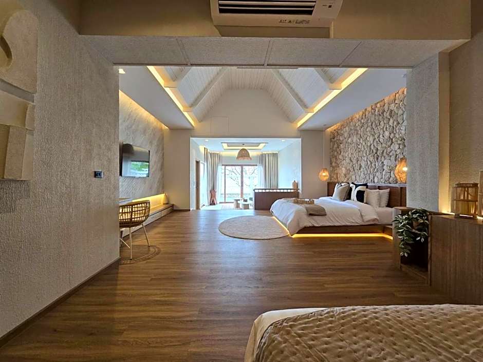 Located on the ground floor and upper floor of a double-story bungalow, the room offers easy access to the shared outdoor pool and sunbeds. The spacious 65-sqm room has a open-plan design with a bed and lounge area with sofas and a satellite TV.